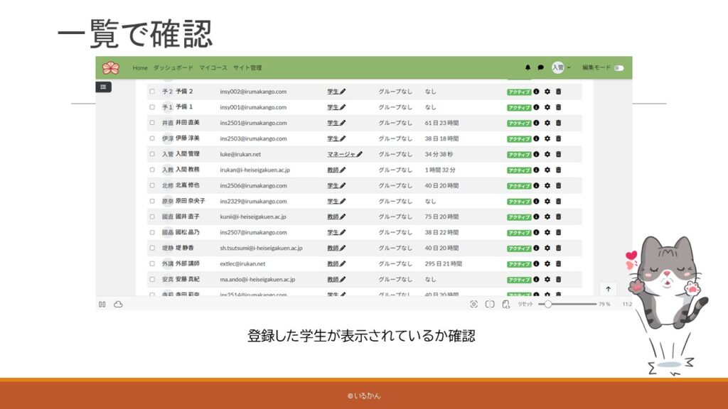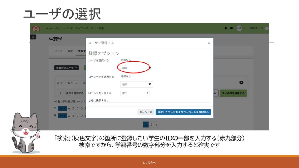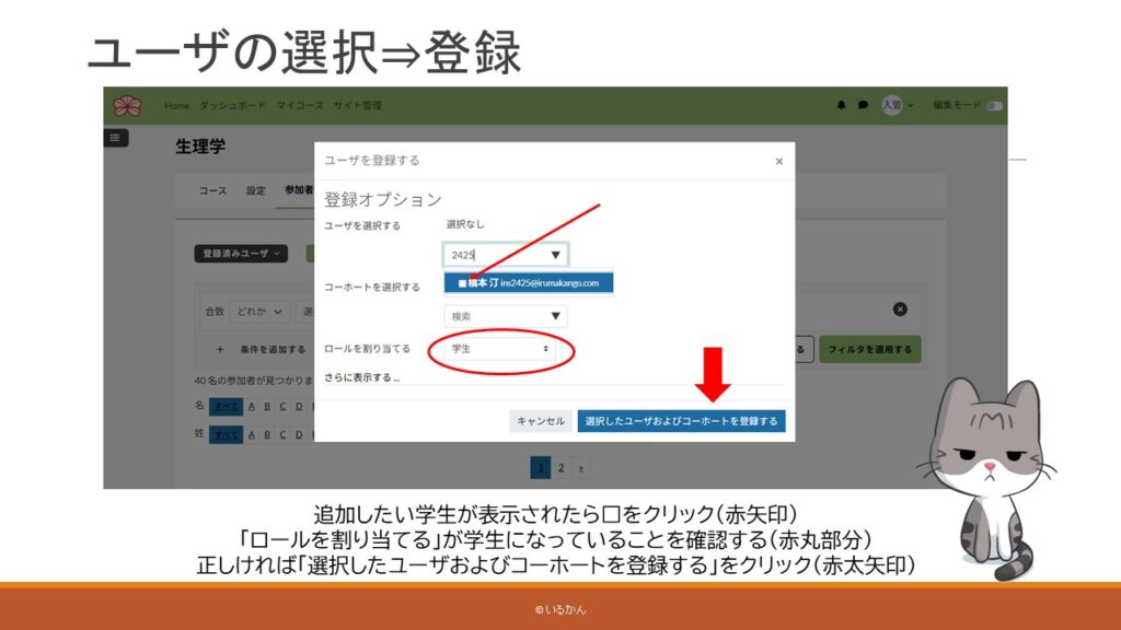 教師・マネジャーのロール(資格)があれば、未登録の学生をコースに追加できます