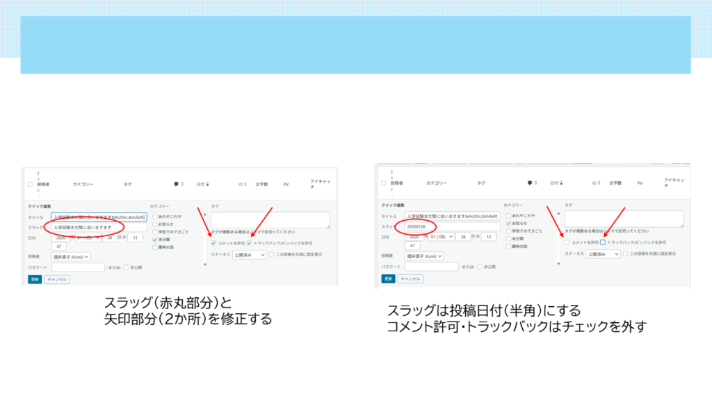 投稿に関する注意事項 2026年2月5日 スラッグを日本語のままにしておくとURLが極端に長くなることによりトラブルの原因になります。また、コメントやトラックバックを許可したままだとスパムが送りつけられる恐れがありますのでこの許可を取り消しておきます。